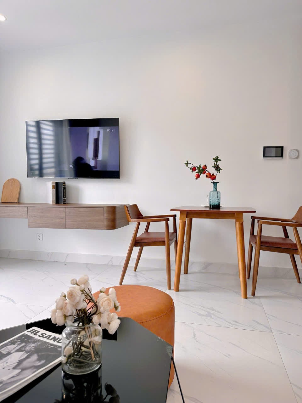 Studio – Vinhomes Grand Park (Uitzicht op zwembad, nabij Vincom) Geniet van een comfortabele rustruimte in een modern studio-appartement, gestroomlijnd maar volledig uitgerust: zacht matrasbed, bank, tv, eigen keuken met koelkast, fornuis, magnetron, waterkoker en eettafel. Het luchtige balkon kijkt direct uit op het groene zwembad, ideaal om te ontspannen na een lange dag.
