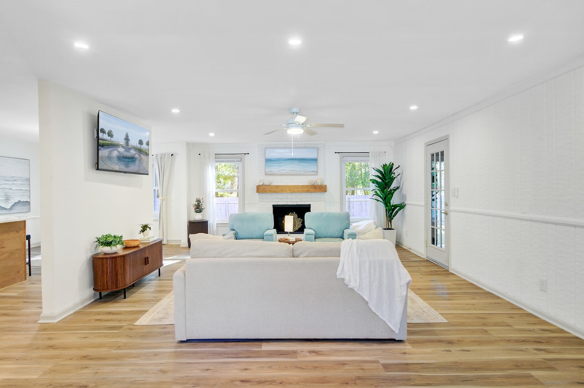 Charleston groep en familie retraite in de buurt van de luchthaven, het centrum en stranden in een rustige privé gemeenschap — ideaal voor bruiloft verblijven, reünies en vakanties. Kenmerken: • Spelletjeskamer met pooltafel, shuffleboard en arcade • Hot tub voor 7 personen + vuurplaats op het terras • Grote keuken en eetruimte voor groepen • Snelle wifi + smart-tv's in slaapkamers • Fietsen om de buurt te verkennen • Gemeenschappelijk zwembad, tennisbaan en speeltuin • Flexibele slaapkamerindeling voor groepen • Dichtbij winkels, restaurants en locaties • Eenvoudig zelf inchecken