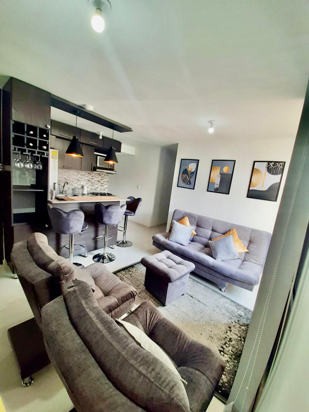 Descubre la comodidad y la placentera estancia en nuestro impecable apartamento Ubicado en un tranquilo conjunto residencial con vistas a las montañas, cada día será un paraíso al despertar. Disfruta de las comodidades que ofrecemos: piscina, cancha, parque infantil, lavandería, estacionamiento privado y vigilancia las 24h. El apartamento está equipado con todo lo necesario, incluido wifi, te hará sentir como en casa, incluso estando lejos de ella. Bienvenido a tu refugio de serenidad y confort.