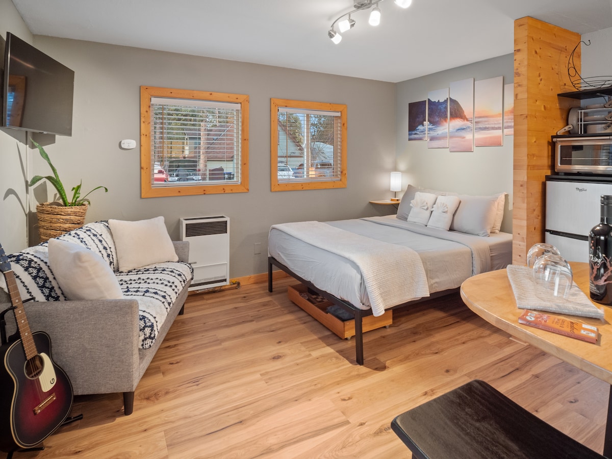 Make this studio your cozy home base during your time in Tahoe. Perfectly located 2 blocks from the beach, dining, & vibrant Ski Run Ave, 4 blocks from the Heavenly Village & Stateline, and within a mile of hiking, biking, & skiing. Explore the guest guidebook with 10+ years of local experience to curate the ultimate adventure for your visit. Wine, chocolate & comfortable organic cotton bedding welcome you. •Free Level 2 Chargepoint EV Charging •Well behaved furry friends welcome for a $30 fee