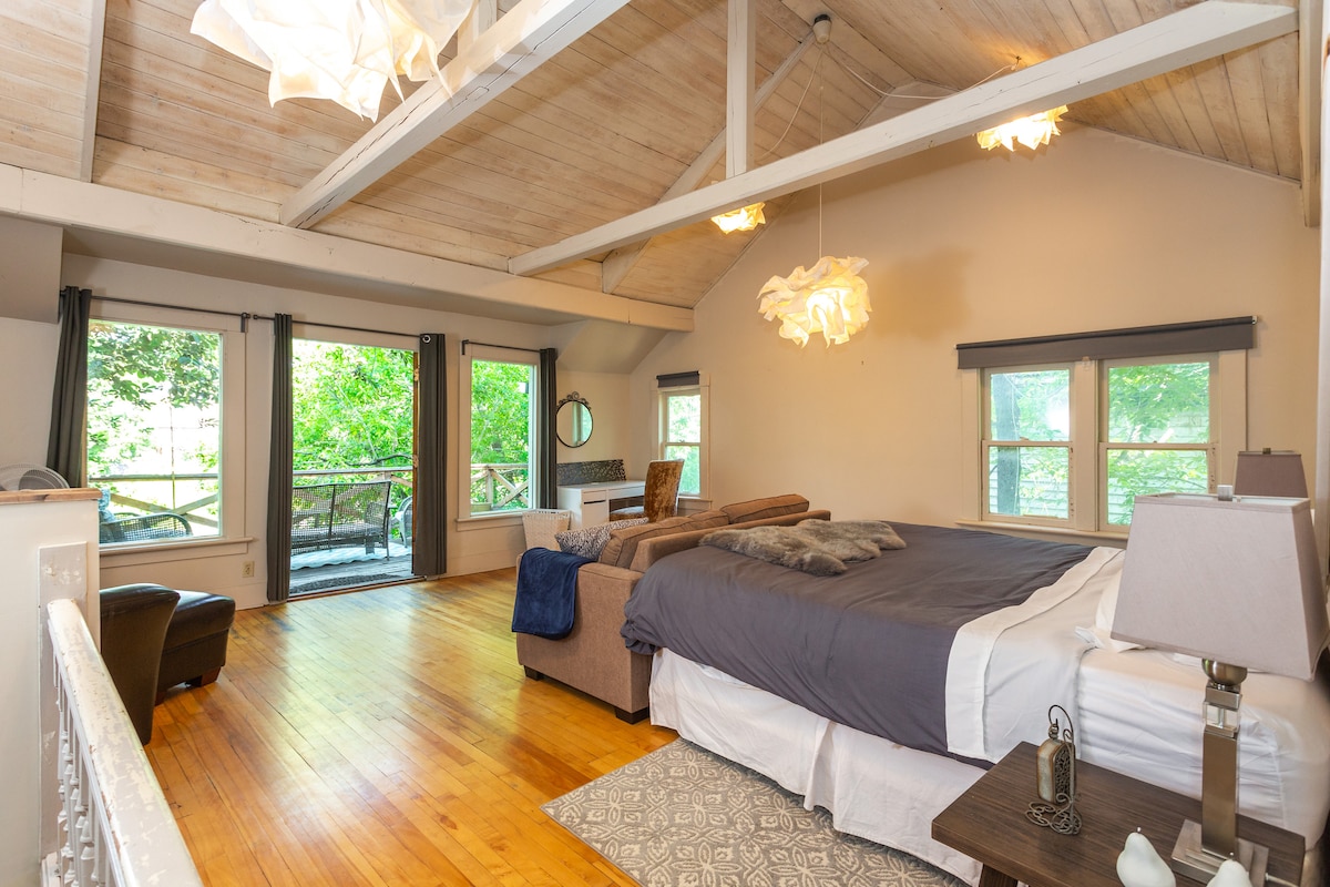 Deze kleurrijke en gezellige suite heeft gratis parkeergelegenheid en een eigen ingang. Het is licht en comfortabel met twee queensize bedden, verduisteringsgordijnen, woonkamer met open haard en grote tv, complete badkamer, volledige keuken, wasmachine en droger, verwarming en airco. Badjassen, slippers, toiletartikelen en basiskookbenodigdheden aanwezig, plus Netflix en Disney+. Laat me weten of je een hond meeneemt, want er geldt een toeslag van $ 30. LGBTQI2SA+ vriendelijk.