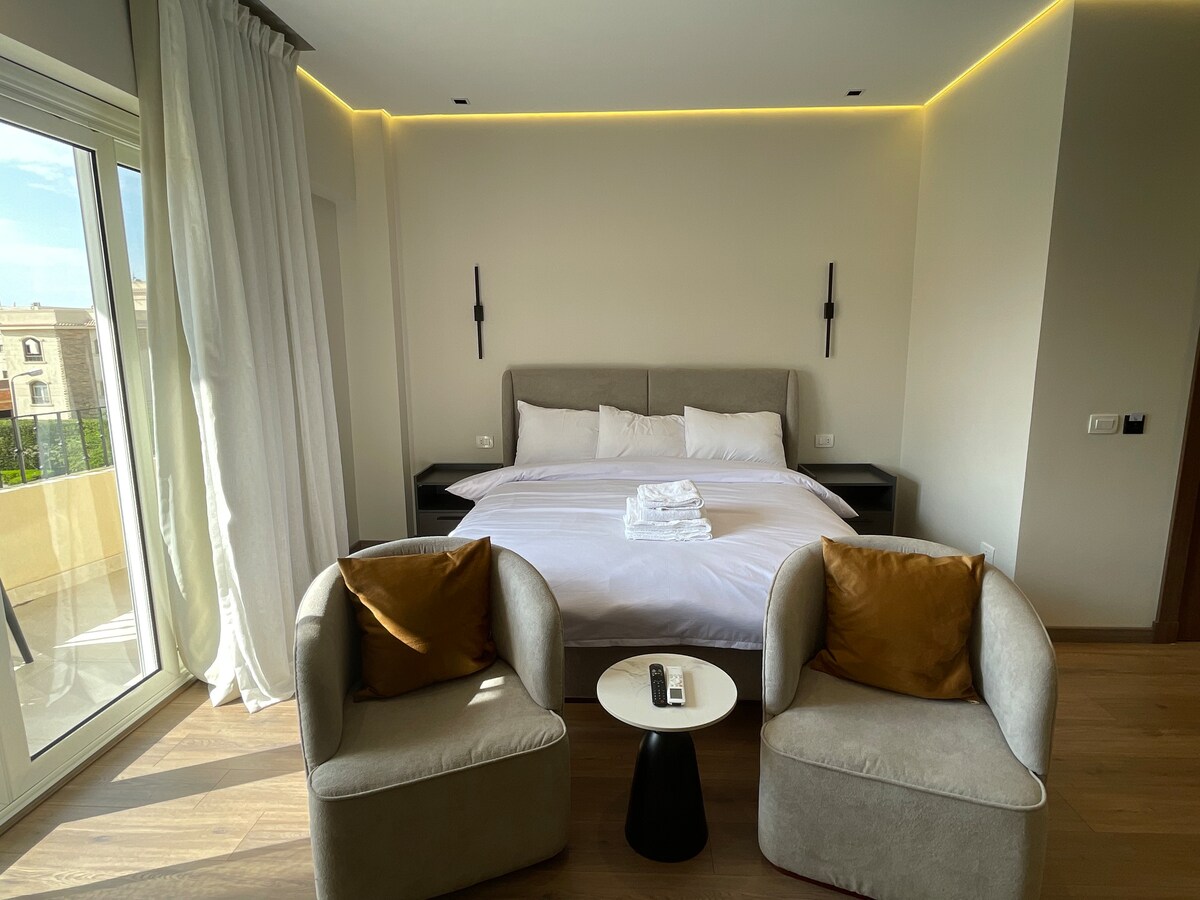 Welcome to our stylish 2-rooms unit, perfectly located just steps from Downtown Mall New Cairo and 8min to Cairo Festival City Mall. Designed for comfort and luxury, this modern unit offers a high-end living experience, whether you’re here for business, leisure, or a weekend getaway with your family. This beautifully designed unit combines the privacy of a 2-rooms layout 1 bed room, 1 living room with sofa-bed and kitchenette, and 1 bathroom, making it a unique and comfortable retreat.