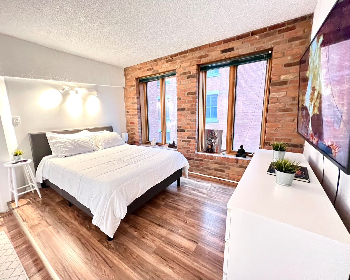 De Savvy is een ruim luxe appartement met 1 slaapkamer in het hart van de oude haven van Vieux-Montréal, op loopafstand van restaurants en de rivier, waar maximaal 4 gasten comfortabel kunnen slapen. Perfect voor winteruitjes, gezinsuitstapjes, zakenreizen, evenementen in het Palais des congrès of een verfijnd verblijf van één nacht. Met hoge plafonds, historische baksteen, een elegant interieur en een rustige slaapkamer met uitzicht op de binnenplaats voelt het als een boetiekhotel, maar volledig privé, met eersteklas voorzieningen, snelle wifi en een 5-sterrenhost tot je dienst.
