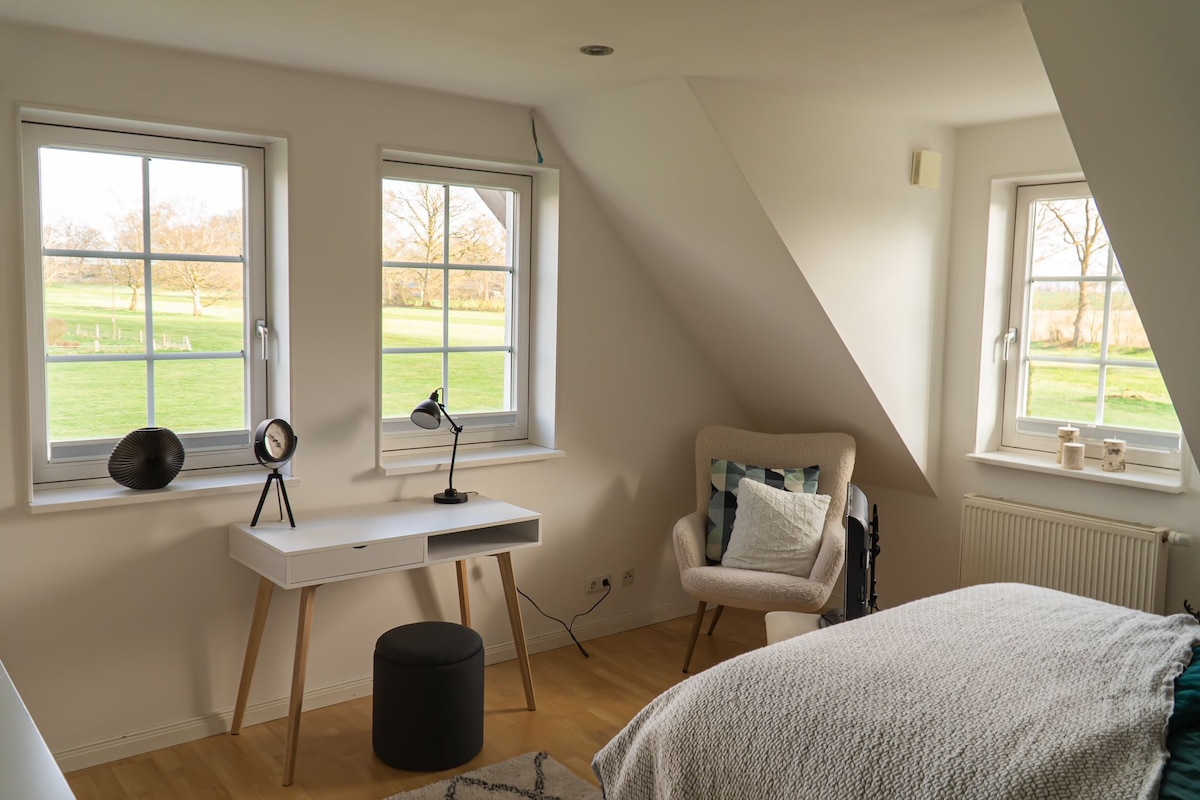 Een exclusief en hoogwaardig appartement van 90 m ² op bovenverdieping van een oude boerderij op een rustige enkele locatie, direct vanaf de oude dijk. Het pand is midden in de idylle, omgeven door talloze velden en een adembenemend uitzicht op de uitgestrektheid. De zee of de dichtstbijzijnde zwemplek is 5-10 minuten met de auto. Meldorf is de dichtstbijzijnde stad, ongeveer 10 minuten met de auto, waar bijvoorbeeld winkelen gedaan kan worden.
