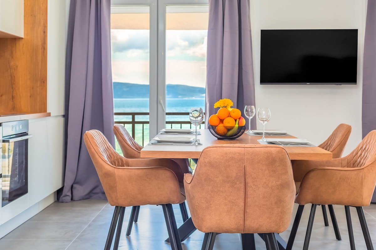 Beautiful, new and comfortable apartment Felis in Duće, for 4-5 people - first row to the beach. This spacious apartment extends over 100 square meters. There are two comfortable bedrooms with double beds (180x200) and two bathrooms (2 shower cabins, washing machine). There is also a living room with an extendable couch (164x195) and fully equipped kitchen with dining area. Apartment has balcony with table and chairs. Each bedroom has air-condition and smart TV.