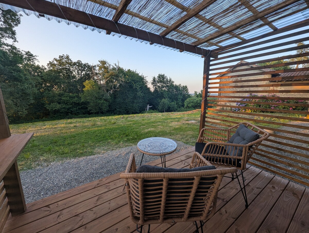 Chalet op het platteland, kom en geniet van de voordelen van een rustige en rustgevende plek. Dicht bij een meer met wateractiviteiten, op 1 uur van skigebieden en Spanje en het dorp op 2 km afstand heeft alle lokale winkels. Dit chalet is geschikt voor 2 personen, met de mogelijkheid van een extra kinderbed, met een woonkamer met een tweepersoonsbed, een uitgeruste kitchenette (elektrisch fornuis, koelkast, waterkoker en magnetron) en een badkamer met douche.