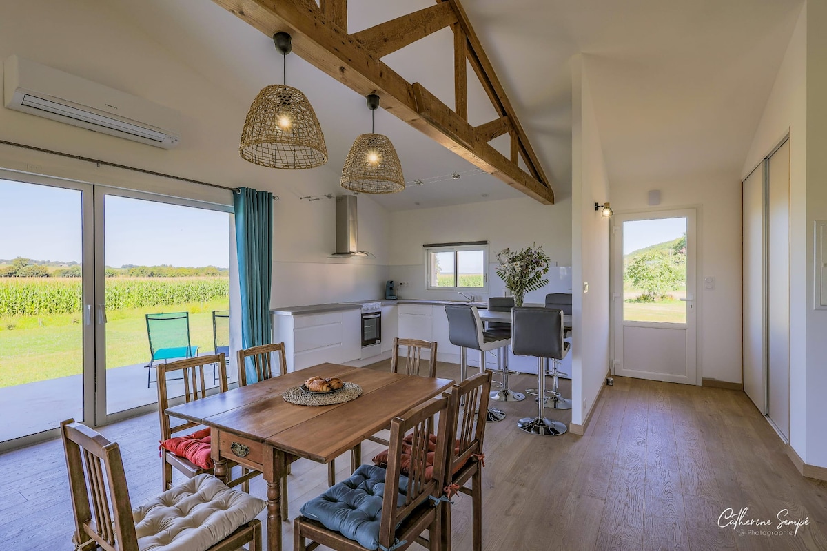 In een 150 jaar oude Gascogneboerderij, gelegen in het dorp Sauviac (Gers) in het hart van het Astarac, ligt de Gites "Les Petit Faulongs". Dit gebouw is omgebouwd tot een moderne en zeer lichte woning op de begane grond. Er komt een groot erker uit op het terras met uitzicht op het Pyreneeënmassief en het platteland van de Gascogne. Geniet van de rust en de natuur, ontbijten op het terras en 's avonds kijken naar de zonsondergang tussen de 2 bomen.
