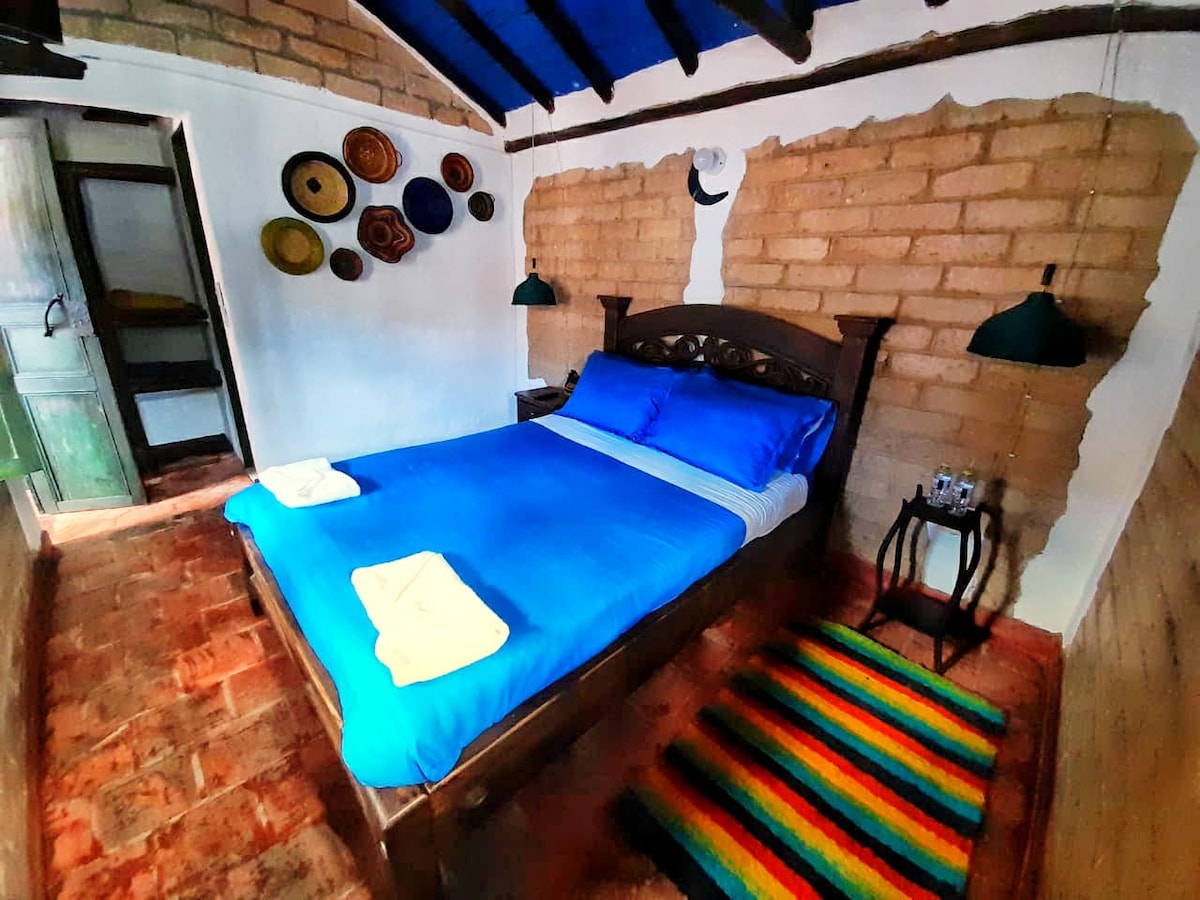 Pueblito Boyacense is een magische toeristische plek in Boyacá die de koloniale architectuur oproept en zeven van de mooiste steden van Boyacá vertegenwoordigt. We zijn een boetiekhotel gemaakt met 'adobe', 'guadua' en gerestaureerd hout. Onze kamer 'Luna de Esparto' telt met een tweepersoonsbed, ideaal voor stellen. De decoratie bevindt zich in een lokaal ambacht dat is gemaakt met 'Esparto', wat een natuurlijke vezel is. De kamer straalt met kleuren en alle magie van deze techniek.