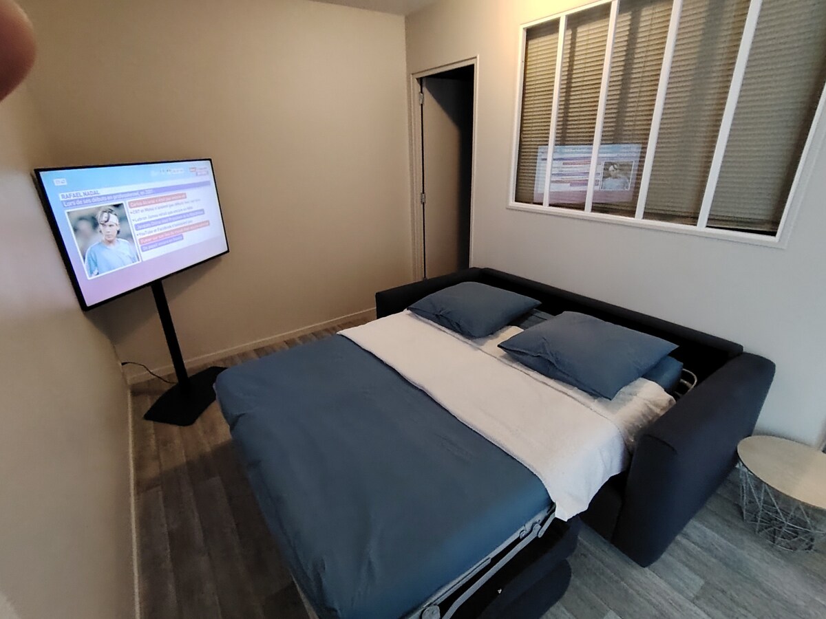 Studio met Mezanine met een bed 140 per 200, keuken, badkamer, wifi, Netflix-abonnement. De tv staat de verspreiding van Netflix toe. Bed 90 per 200 cm in de zithoek die fungeert als een bank en tweede slaapbank Veilig gebouw - camera 's in de openbare ruimtes De toegankelijkheid van het appartement is niet geschikt voor personen met gereduceerde mobiliteit