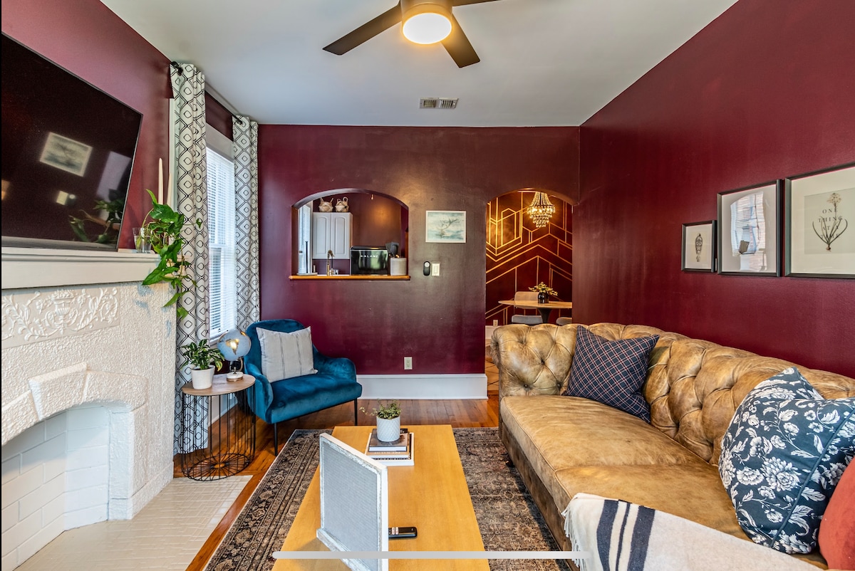 Geheel appartement gelegen in Historic Springfield. Het appartement is warm en uitnodigend met bordeauxrode muren, een bibliotheekbank en tulpen ovale tafel. De slaapkamer heeft een queensize bed. Op de 3e verdieping, geen lift. Zorg ervoor dat je de huisregels en de beschrijving van de buurt leest, zodat er geen verrassingen zijn nadat je reservering is bevestigd. Ringcamera 's bewaken alle ingangen en zijn beweging geactiveerd.