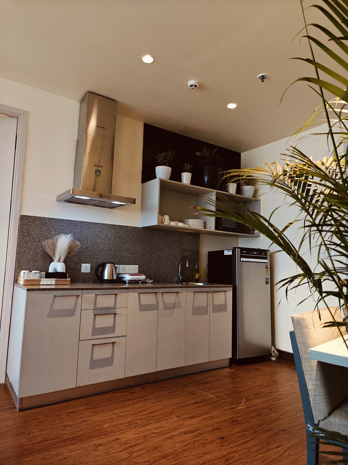 Welkom in onze luxe stedelijke studio, een toevluchtsoord van stijl en verfijning in het bruisende hart van de Gurgaon. Een opvallend kenmerk van onze loft is speciaal zwart kleurenschema, dat een vleugje elegantie en drama aan de ruimte toevoegt, waardoor je verblijf comfortabel en prachtig is. Als je onze elegant ingerichte studio binnenstapt, word je begroet door het zien van onze zachte zwarte ligstoelen. Deze twee luxe ligstoelen zijn het middelpunt en bieden een perfecte mix van eigentijds design en uitzonderlijk comfort.