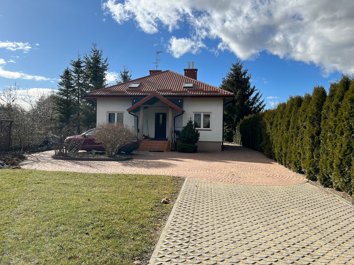 Leśna enklawa Siedlisko w środku lasu, stary dom „z duszą”, dla osób pragnących oderwać się od zgiełku miasta, dla miłośników przyrody, czystej wody i zdrowego powietrza. Położony w parku krajobrazowym, opatrzony ciszą i rytmem leśnego etosu. Udostępniona powierzchnia domu – 150 m 2 : Salon z kominkiem, 3 sypialnie, rustykalna kuchnia z pełnym sprzętem gospodarczym, 2 łazienki z kabinami prysznicowymi, wyposażone w ręczniki i przybory toaletowe. Taras, ogród, sad i las.