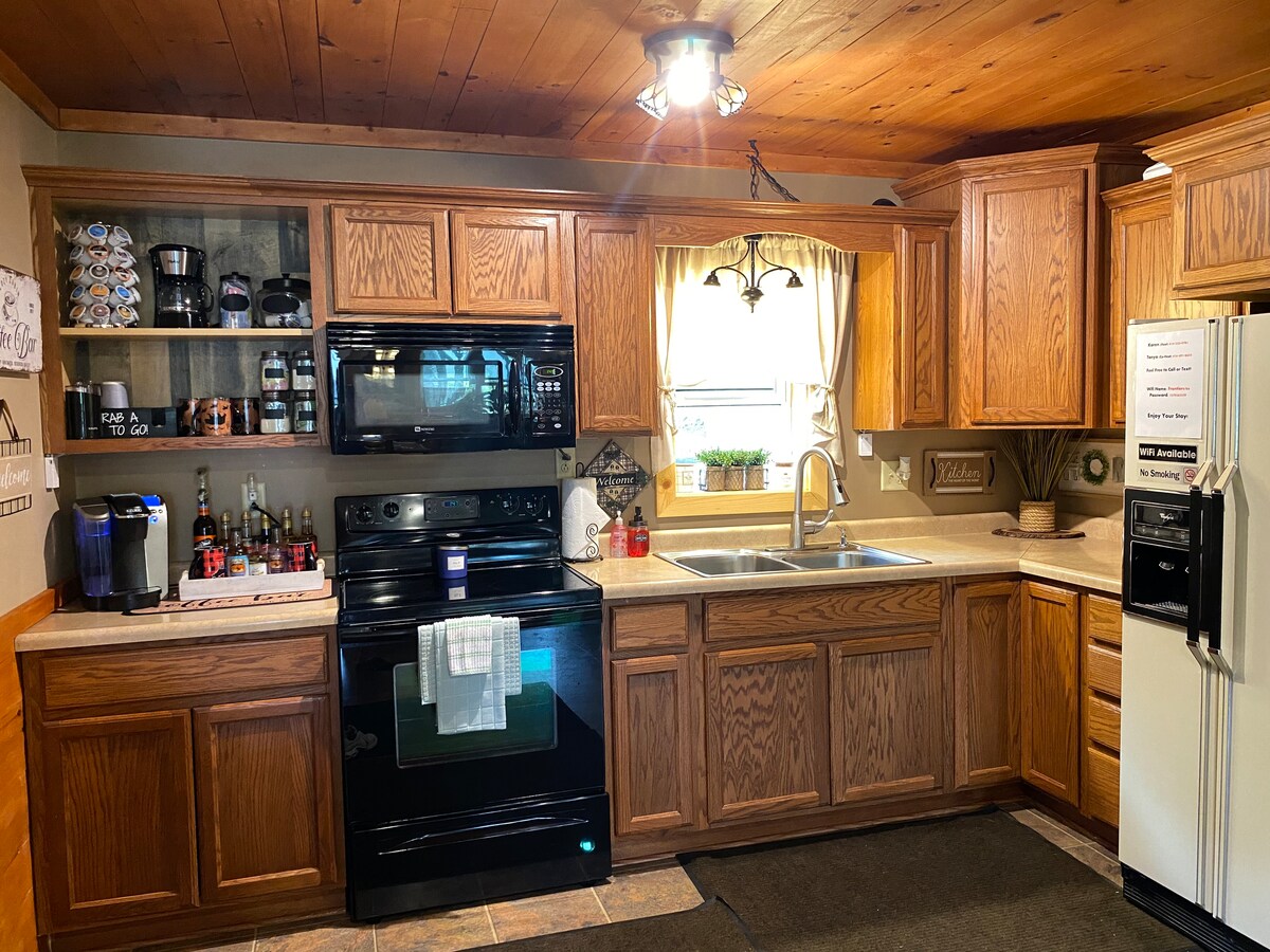 Gezellig huis beschikt over warme verlichting en verfkleuren en creatieve Northwoods met een modern tintje. Tot de voorzieningen behoren snel internet, roestvrijstalen apparaten, koffiezetapparaat, wasmachine en droger aan de voorkant, streamingdiensten/Apple TV, drie flatscreen-tv 's, twee open haarden , centrale airconditioning en een zeer efficiënte oven. De woning ligt op 4 beboste hectare (niet aan het meer) aan een goed onderhouden grindweg. Zeer privé. Geen buren in zicht. Wildlife is er in overvloed. Honden zijn ok met goedkeuring en vergoeding.