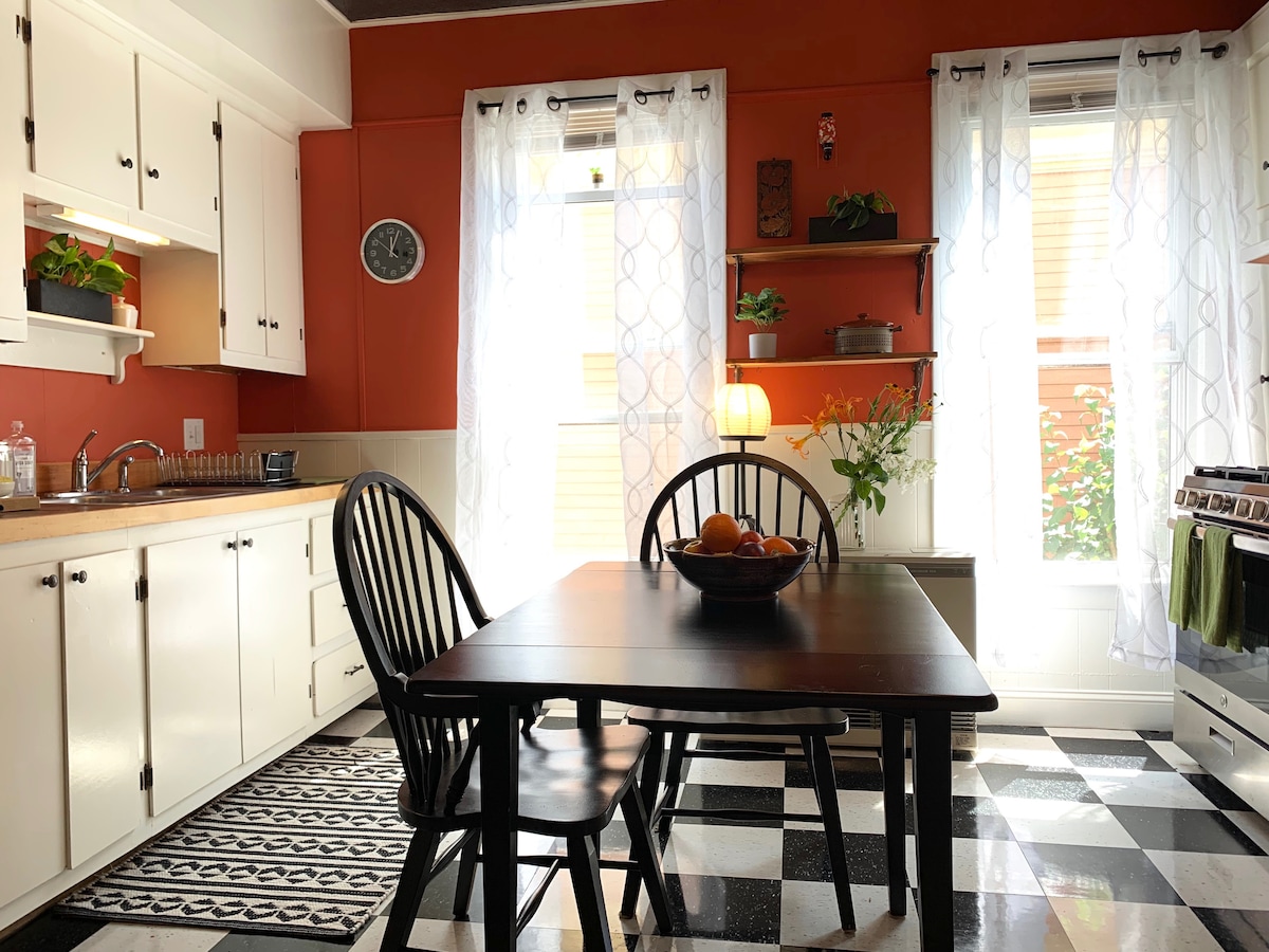 Retro BnB in The Heart of Portland 's East End biedt een combinatie van 70' s mod charme met een levendige comfortabele stijl. Zonnig appartement op de eerste verdieping met eigen ingang, een hybride spoel/thermaal queensize bed met uitzicht op de tuin met mooie vaste tuin, badkamer met centrale, goed ingerichte keuken/eetkamer. Deze ruimte is perfect voor één stel dat op zoek is naar een gezellige thuisbasis. Op loopafstand van gastronomische restaurants, cafés, East End-strand en alle Portland schiereiland te bieden!