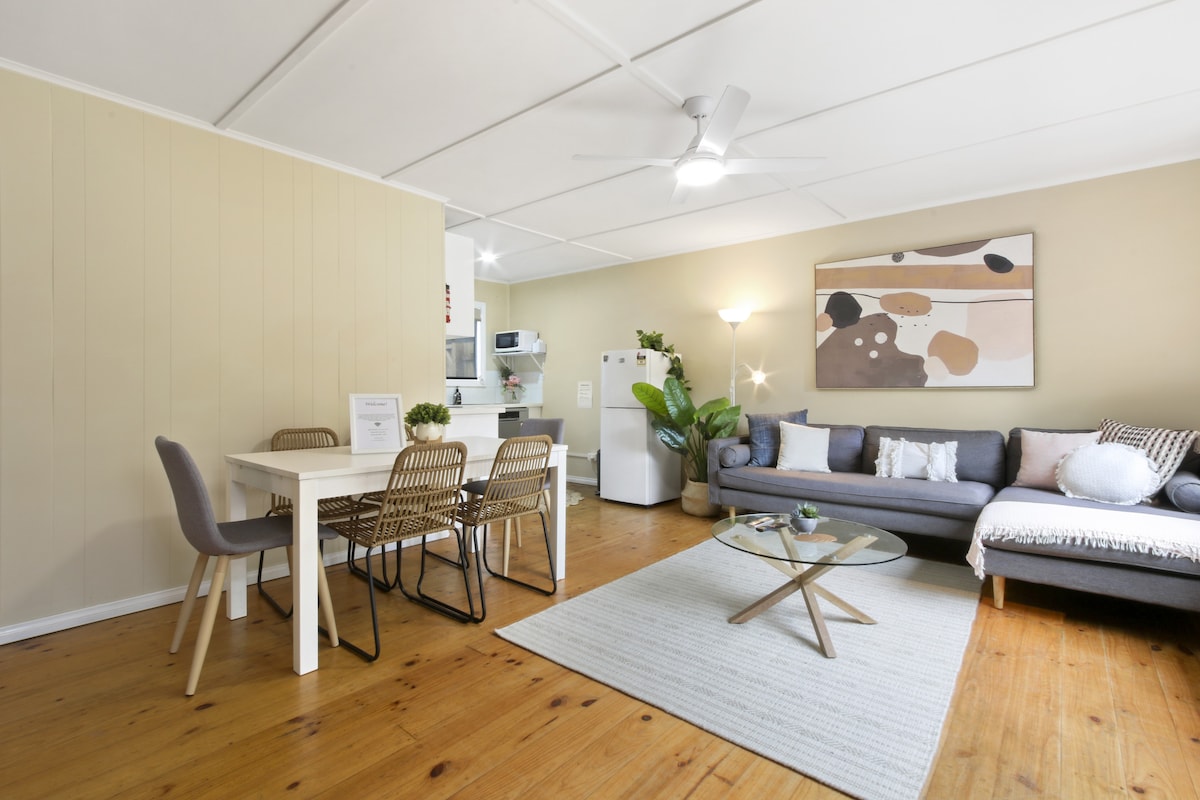Het gerenoveerde interieur van Koala Kottage beschikt over een woonkamer, eethoek, prachtige grote eigen badkamer met uitzicht op de binnenplaats en een ultramoderne, volledig uitgeruste keuken . Er is ook een eethoek en BBQ buiten op het overdekte dek met wijnstokken of maak gebruik van de zithoek met een barbecue kookplaat . De Kottage beschikt over gewelfde houten plafonds met hemellicht. Omgeven door een natuurlijke habitat van gombomen, koala 's, kangoeroes en kleurrijke inheemse vogels.
