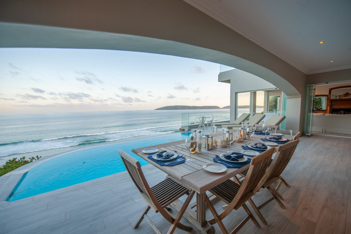 Prachtige Plett Villa, gelegen op het hoogste punt op Plett 's prestigieuze Beachy Head Drive met alle gemakken die je zou verwachten, waaronder thuisbioscoop, privé, directe toegang tot het strand, dagelijks onderhoud en een adembenemend uitzicht.