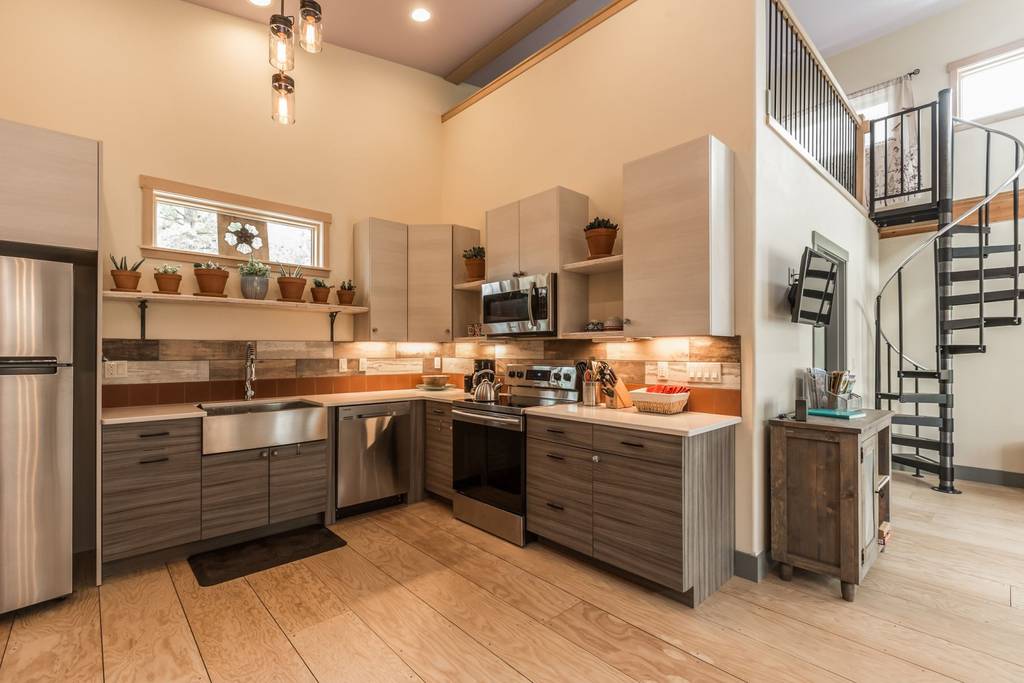 Bright and spacious Loft with open Living/Dining and Kitchen area. Large, comfy couches positioned in front of a warm and cozy gas fireplace and Smart TV. Prep a meal in the spacious kitchen with all new appliances and cabinets. All new dishes, cookware and utensils. Enjoy coffee on the patio from a Keurig. There are 2 Bedrooms with Queen size beds and an open Loft area at the top of the spiral staircase with a Queen bed as well. Great place to enjoy family and friends.