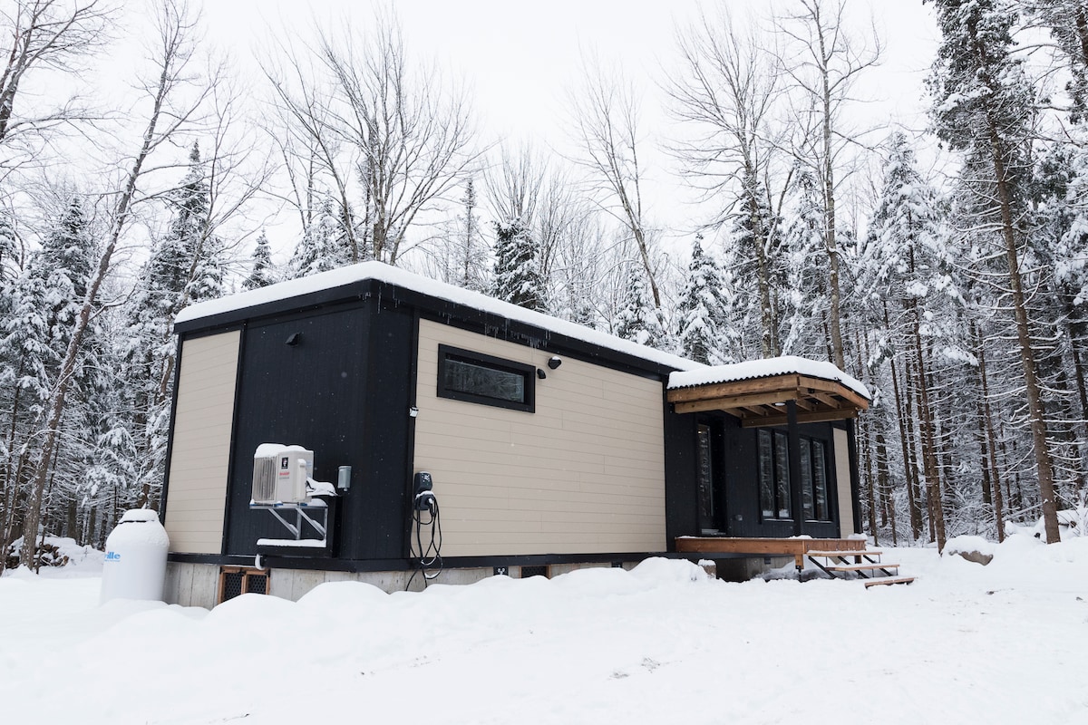 Ons Scandinavisch boschalet is perfect om quality time door te brengen als een stel (of met een kind), of voor een work-retreat (met snelle wifi). Het houten interieur is warm en gezellig. De ramen op volledige hoogte bieden een prachtig uitzicht over een beboste vallei. De open keuken en woonkamer houden je in het gesprek tijdens het koken. Als je liever buiten kookt, is er een vuurplaats met een grill en een eettafel in de buitenlucht. Slechts 70 minuten rijden van Montreal. Het meer ligt op 25 minuten lopen als je in de buurt parkeert.