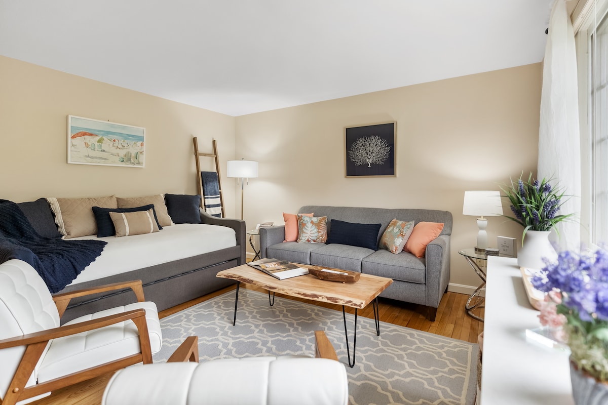 Dit stijlvolle appartement met 2 slaapkamers ligt in het hart van Newport, aan de Historic Bellevue Ave, en is volledig ingericht met een unieke en luchtige inrichting. Deze toplocatie ligt op slechts enkele minuten van de opmerkelijke Tennis Hall of Fame, de prachtige waterkant in het centrum en boetiekjes. Verbeter je verblijf met al onze handige voorzieningen. We hebben alle nodige stappen ondernomen om uitzonderlijke netheid te garanderen om een veilig en aangenaam verblijf te bieden. Onze verhuur biedt comfort en charme geschikt voor elke gelegenheid!