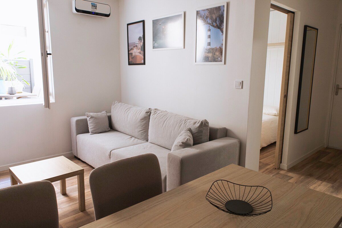 T2 appartement in duplex van 44 m² in het centrum van Rochefort. ATYPISCH: de eetkamer is gelegen in een tweepersoons bladerdak met een panoramisch uitzicht COMFORT: De slaapkamer heeft beddengoed van hoge kwaliteit en een bed van 160x200 BRIGHT: South and Southwest Exposure LOCATIE: Downtown Rochefort en tegenover een gratis parkeerplaats voor 1000 zitplaatsen STILTE: Woonkamer- en slaapkamerramen kijken uit op de binnenplaats