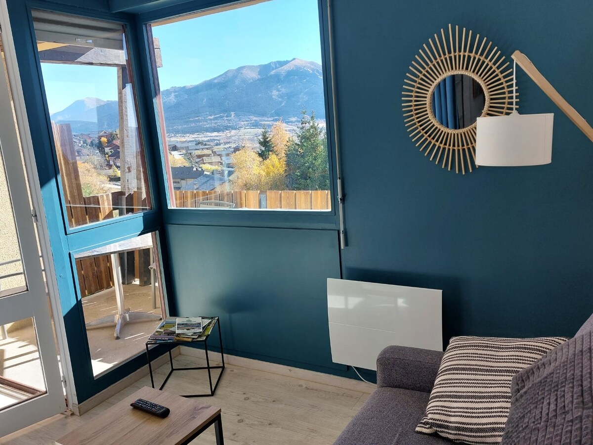 48m² appartement, volledig gerenoveerd, met balkon van 18 m² op het zuiden, voor 6 personen met prachtig uitzicht, op 5 minuten lopen van het centrum. Volledig uitgeruste keuken. Slaapbank in de woonkamer. De eerste slaapkamer heeft een gezellig bed van 160 cm met uitzicht op de bergen. De tweede slaapkamer met een slaapbank van 140 cm. Hoogwaardig beddengoed. Beddengoed / dekbedovertrekken/ kussenslopen en badhanddoeken worden niet verstrekt.