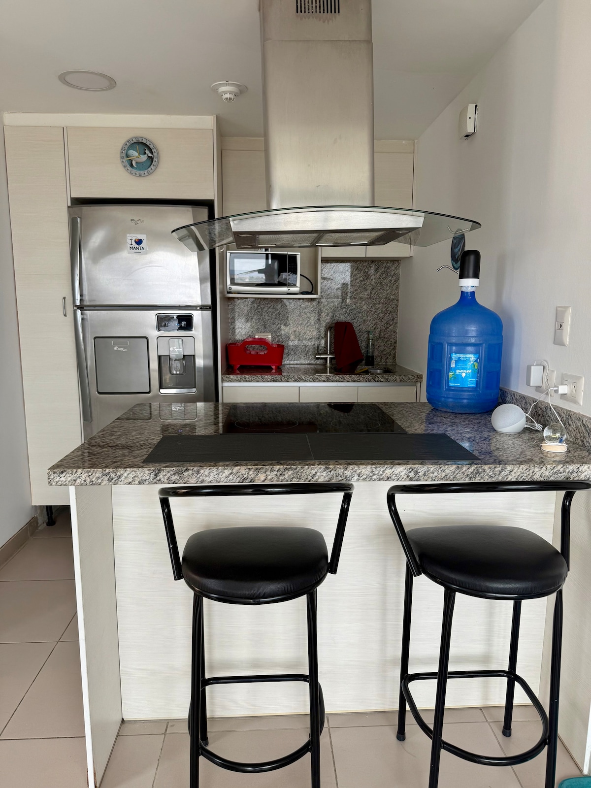 ✨ Appartement in Manta voor 5 personen op een steenworp afstand van Playa Murciélago en het winkelcentrum. 🌅 Diagonaal naar 'La Novia del Toro'. Ontspan in de hangmat op ons grote balkon met zeebries. 🛏️ Hoofdslaapkamer: queensize bed + eigen badkamer 🛌 Kamer 2: Bed van 2 vierkante meter + badkamer aan de overkant van de straat. 🛋️ Geweldige woonkamer met slaapbank en complete keuken. 🏊♂️ Gebouw: zwembad, jacuzzi, fitnessruimte, parkeergelegenheid en 24/7 beveiliging. ⚠️ Vereiste: bij het inchecken bij de receptie wordt een legitimatiebewijs gevraagd.