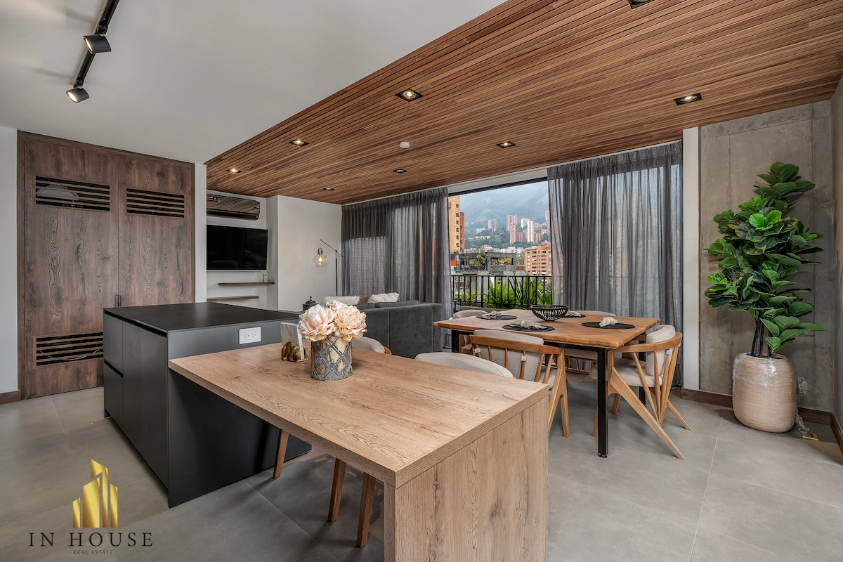 ONLANGS GERENOVEERD - Snel internet, ideaal voor werken op afstand - Gloednieuwe airco - Volledig gerenoveerd industrieel designappartement - Kingsize bed - Adembenemend uitzicht op Medellín (geloof me, de moeite waard om hier te verblijven) -19e verdieping -Onklopbare locatie in Poblado vlakbij Provenza en Lleras Park -Moderne voorzieningen - Ruime zithoek - Slimme tv x 2 - Volledig uitgeruste keuken - Wasmachine en droger - Biljart - fitnessruimte - Werkruimte - Restaurant in het gebouw - Privéparkeergelegenheid - Zelf inchecken -24/7 Beveiliging