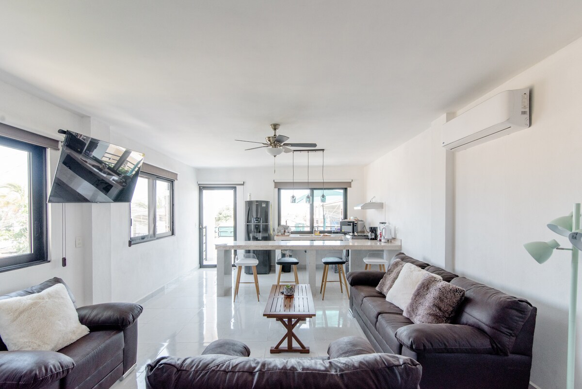 Escape to Casa Chili, a modern top-floor apartment in San Jose del Cabo's vibrant art district. Perfect for two, this retreat offers a fully equipped kitchen, parking and a stunning shared rooftop with a heated infinity pool and 360° views. Just steps from Plaza Mijares, top restaurants and galleries. Experience the best of Cabo in style and comfort.