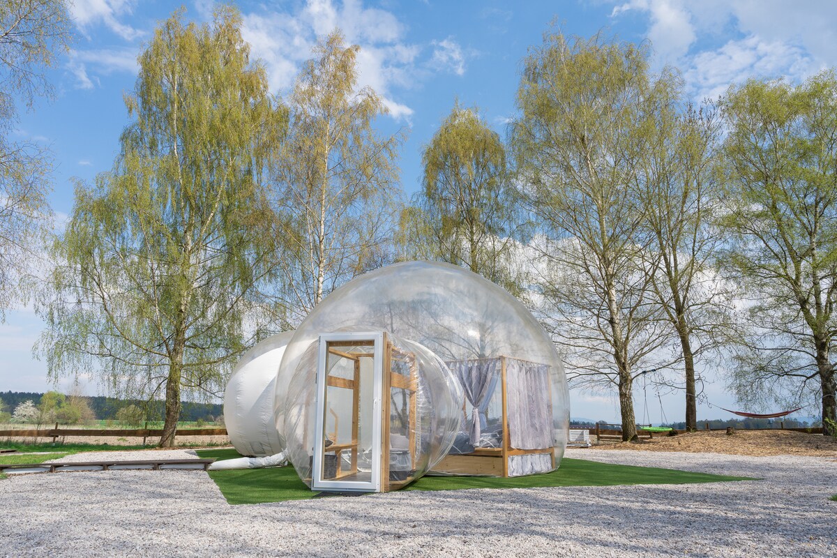 Bublina se nachází uprostřed přírody, v dostatečné vzdálenosti od světelného smogu. Je uzpůsobena až pro 4 dospělé osoby, avšak ideálně pro 2 dospělé a 2 děti. Není problém připravit i dětskou postýlku pro dalšího člena. Místo je vhodné pro každého, kdo chce zažít nevšední zážitek při usínání v Bublině, která vám umožní výhled do všech stran, kde budete spjatí s přírodou. A přes den naleznete na ploše 2000 m2 jak dětské, sportovní, campingové, tak relaxační vyžití pro celou rodinu.