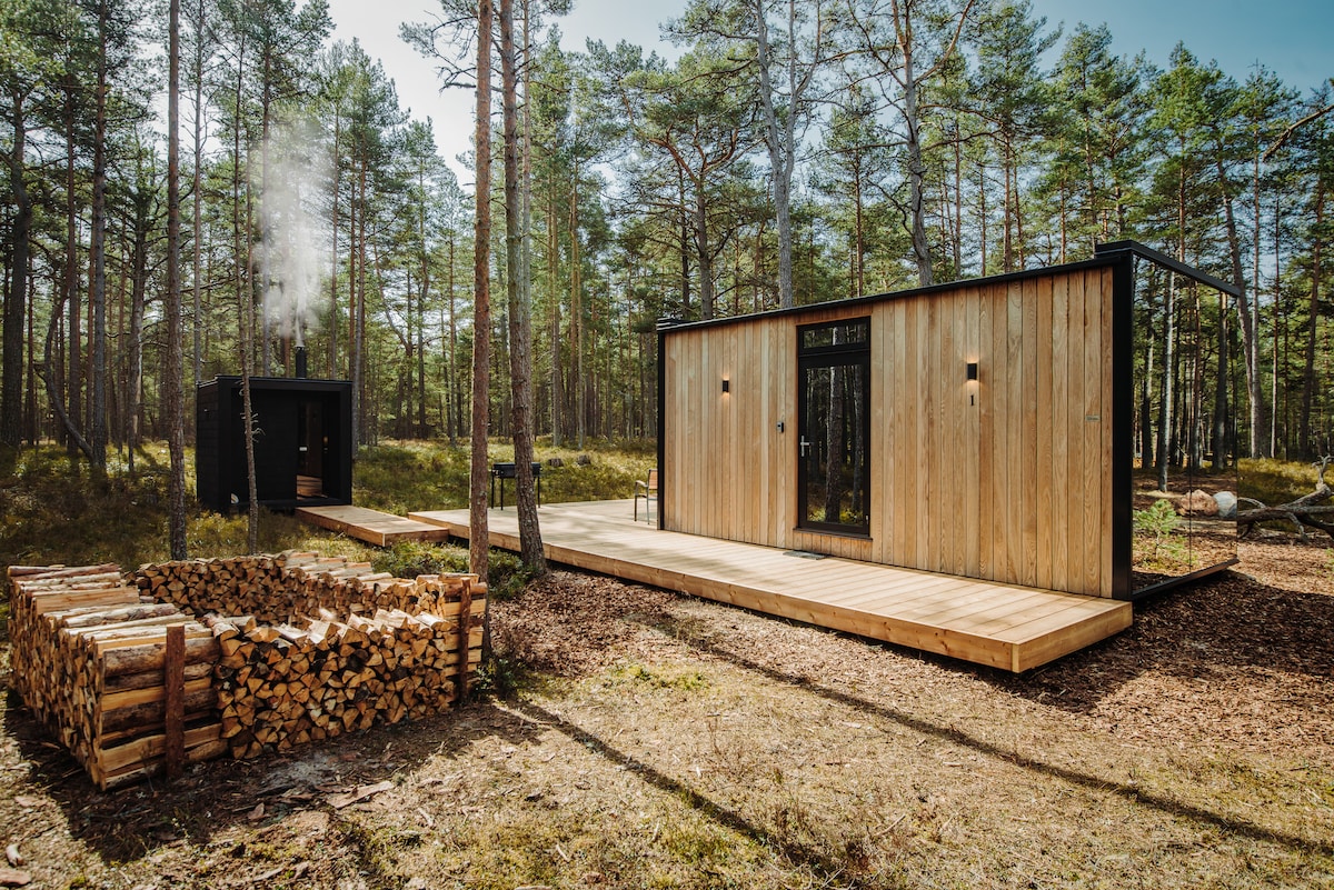 Dit compacte, moderne tinyhouse ligt aan de westkust van Estland. Bedoeld voor mensen die willen genieten van een natuurlijk toevluchtsoord zonder moderne gemakken op te geven. Het huis beschikt over een sauna, bubbelbad, een douche met verwarmde vloeren, toilet, een open woonkamer en een slaapgedeelte op de 'zolder'. Het huis is uitgerust met wifi, tv met Netflix-toegang, koffiezetapparaat enz. Verwarming/koeling wordt verzorgd door een geïntegreerde airconditioner De woning is het hele jaar door te genieten.