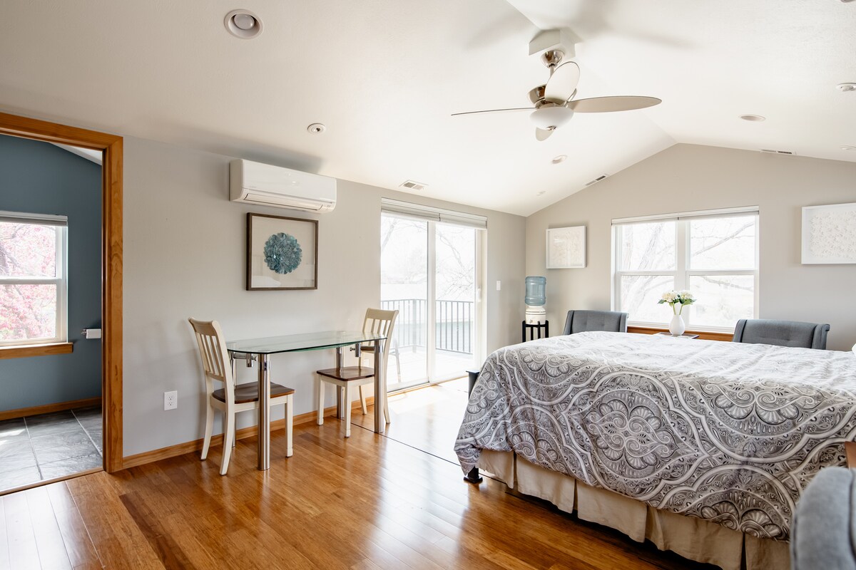 Grote studio met een queensize bed en eenvoudige kitchenette. Aparte ingang + privédek in een rustige buurt. Restaurants + coffeeshops in de buurt in een gebied van Boulder dat bekend staat als Gunbarrel. Central Boulder 15 min Longmont 15 min. Magnetron, waterkoker, koffiezetapparaat, elektrische koekenpan, panini-koelkast (geen vriezer) en wastafel (in badkamer). Airconditioning/verwarming aan de muur. Geen geurreiniging. Geen tv. EV-opladen beschikbaar - details in andere sectie. J1772-oplader