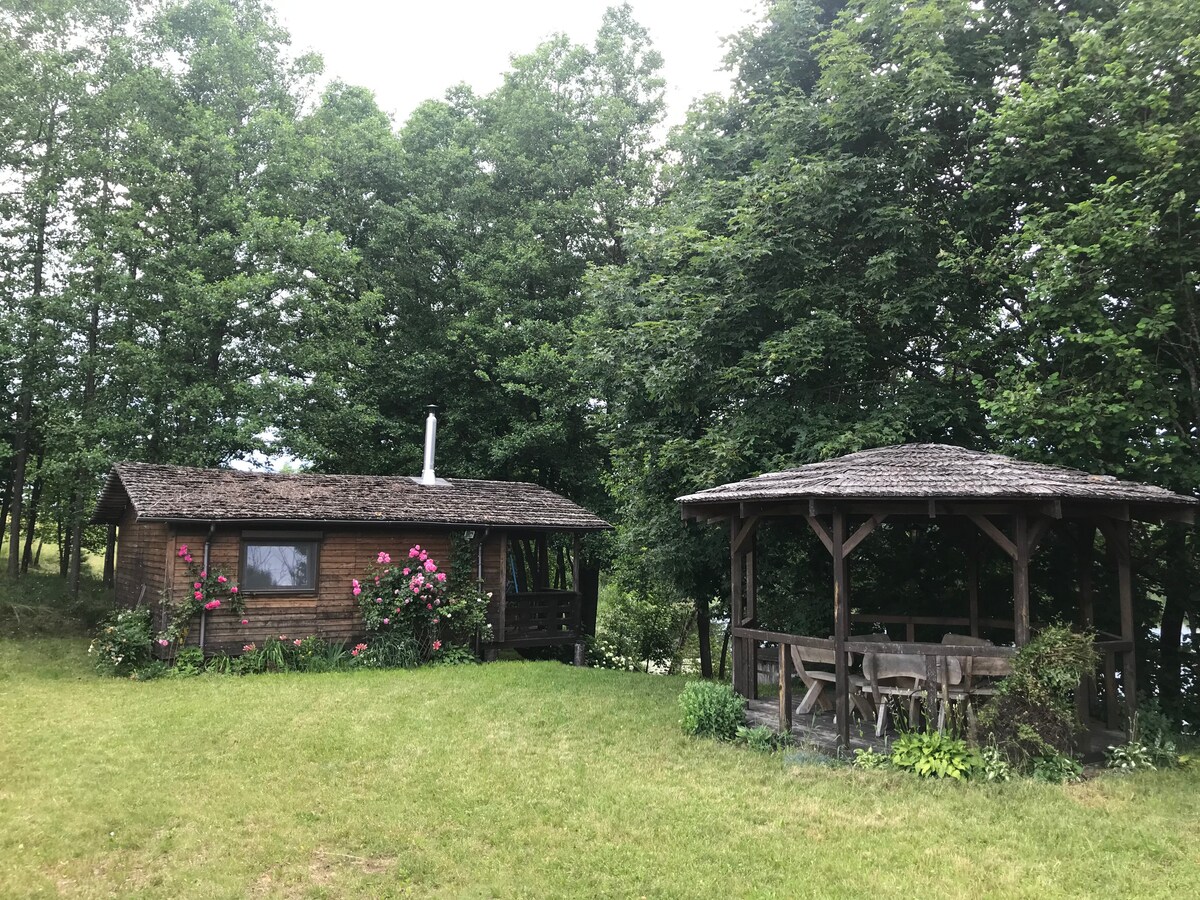 We hebben in totaal drie hutten aan het meer in ons gebied. Sauna Cabin ligt op 30 meter van het meer en is omgeven door bos. Geweldige sfeer voor beide stellen. Houten huisje is voorzien van alle benodigde voorzieningen. Houten huisje verdeeld in 3 delen: woonkamer, slaapkamer en toilet. Elk is van buitenaf bereikbaar. Er is een houtskoolgrill (je hoeft alleen houtskool of hout mee te nemen) kano, geluidsinstallatie: muziek kan buiten tot 22.00 uur worden afgespeeld. Sauna 40 en jacuzzi bubbelbad van € 80. Dichtstbijzijnde winkel op 2 km afstand.