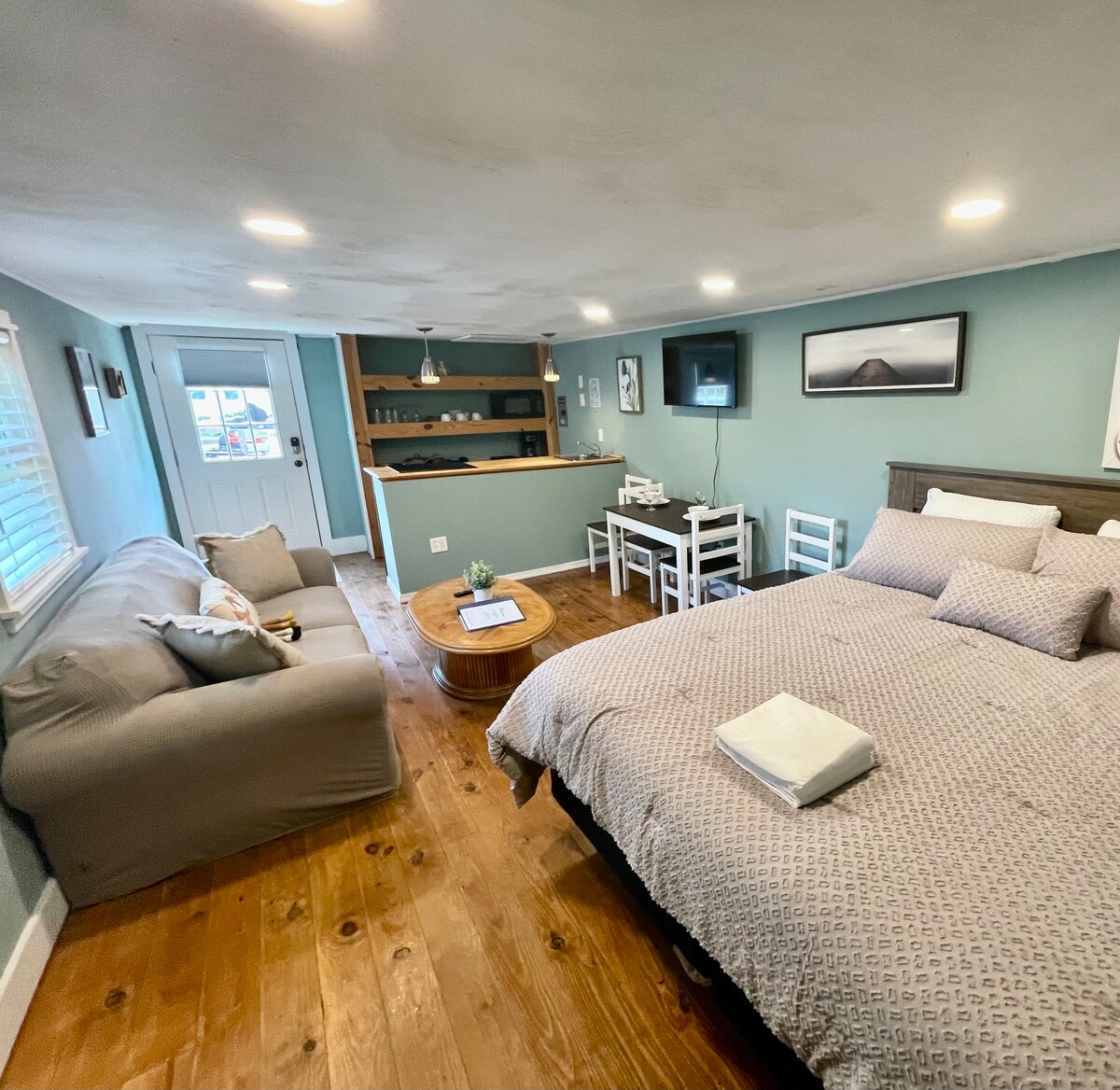 The Duck Inn is a 320 sq ft efficiency apartment adjacent to the Lunker Lodge. It has a private entrance, full bathroom, ample closet space and is furnished with a queen sized bed (new Nectar mattress), and a loveseat with full sized pullout. Kitchen area is equipped with a microwave, toaster oven, hot plate and Keurig coffee maker and basic kitchenware.