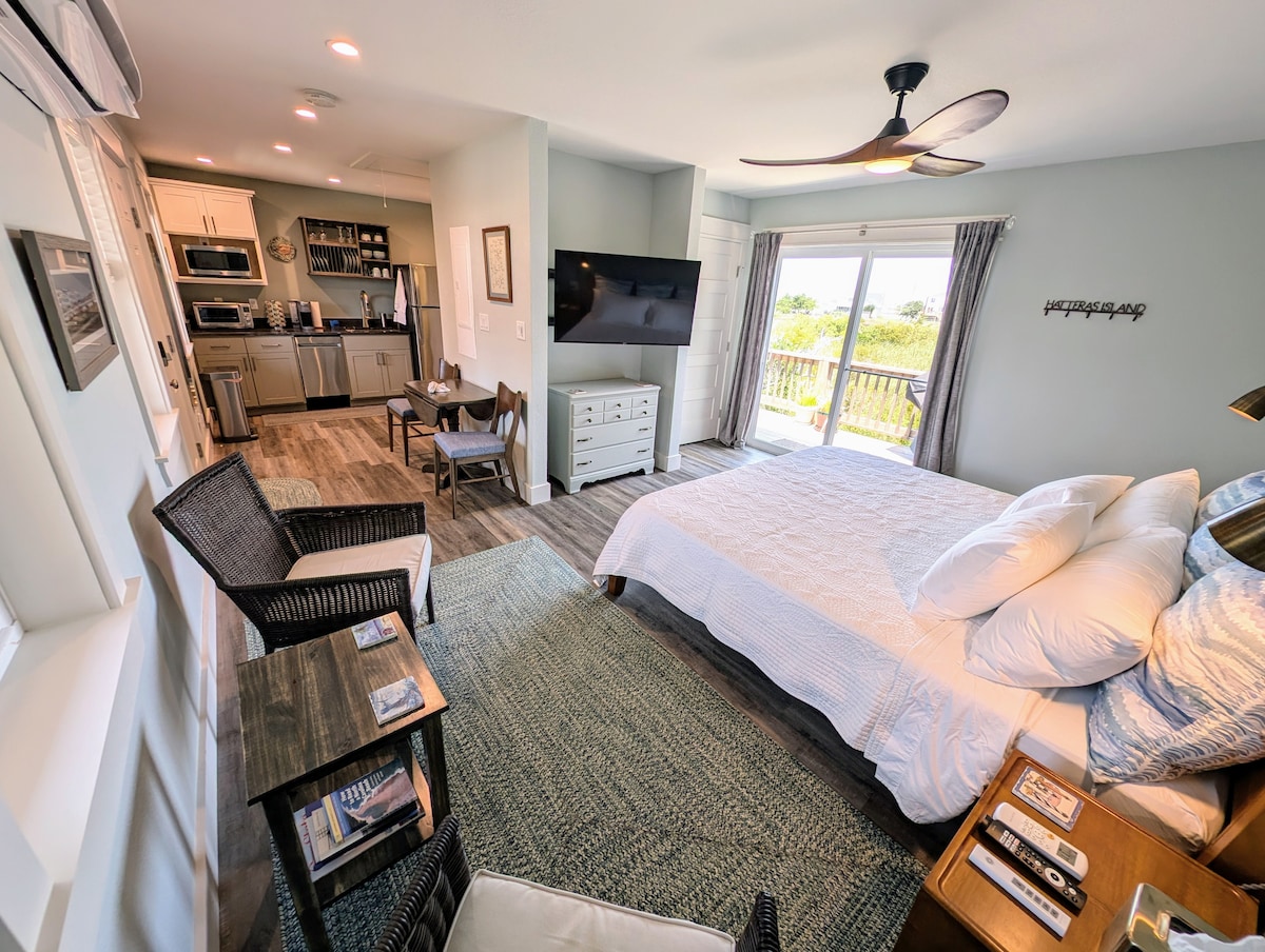 Welcome to Green Gates! This light and airy space is designed with peace and recharge in mind! This studio apartment is located just seven houses from the beach in Frisco--a quick 2 minute walk or an even quicker bike ride. Sleep well in a cozy king bed wake up and enjoy your coffee on a tucked-away patio. The space feels tucked away and is equipped with a mini fridge, griddle, waffle maker, coffee essentials, rice maker, and more. We'll see you soon!
