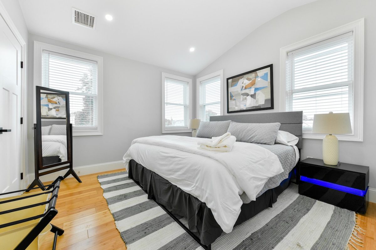 Nieuw gebouwd in 2021. Met: kingsize bedden. Drie complete badkamers en parkeergarage. Wasmachine en droger in de unit. Een ruime keuken met een grote eettafel en alles wat je nodig hebt om een maaltijd te maken. Centrale airco. Zelfs een jacuzzi! Ideaal gelegen in een rustige woonwijk en op slechts 5 minuten lopen van het dichtstbijzijnde metrostation. 10 minuten van Logan Airport en 15 minuten van het centrum van Boston. Op steenworp afstand van restaurants, cafés en bakkerijen. Perfect voor gezinnen of zakenreizigers.