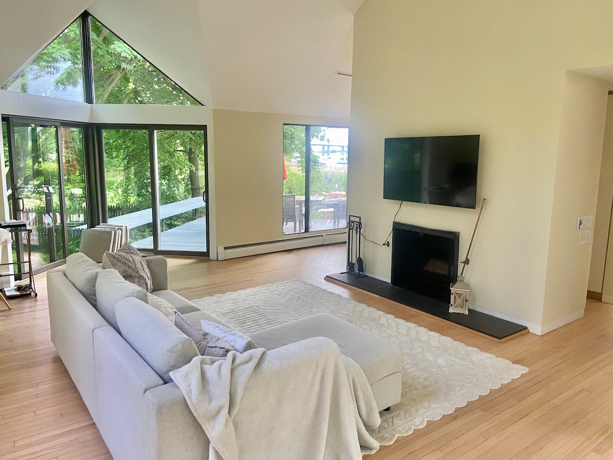 Dit mooie huisje ligt direct aan de rivier de Patchogue met vanuit elke kamer een schilderachtig uitzicht op de rivier en de moerassen en op slechts 1/4 mijl lopen of fietsen naar het strand. Privé, maar dicht bij zoveel, is het perfect voor een romantisch uitje of een lange vakantie. Buiten kun je genieten van de bries vanaf het Riverfront Deck, Sun Bathhe, Krab of Fish op de Lower Dock, de Eagles zien voorbij vliegen of dwalen over het bosrijke terrein. Neem of huur een kajak en peddel over de rivier naar de Long Island Sound.