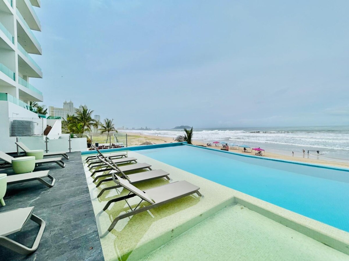 Nieuw en ruim appartement direct aan een van de meest rustige en mooie stranden in Mazatlan! Het verwarmde zwembad in de winter met uitzicht op zee is slechts het begin omdat je toegang hebt tot alles wat je nodig hebt voor een fantastische vakantie: lift, een uitgeruste keuken, bedden, parasols, strandhanddoeken en zelfs restaurantservice. Het is de ideale plek om tot rust te komen en er ten volle van te genieten.