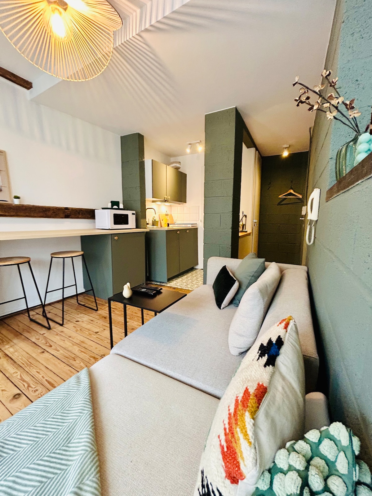 Charmant en warm appartement volledig gerenoveerd met twee verdiepingen. Het zeer lichte appartement bevindt zich op de 1e verdieping van een huis in het hart van het centrum aan een rustige straat op minder dan 300 m van het grote plein. Op de eerste verdieping, de woonkamer en de volledig uitgeruste Amerikaanse keuken. De tweede verdieping opent naar een ruime slaapkamer met een tweepersoonsbed, de badkamer met douche en toilet en toegang tot een eigen terras met uitzicht op de daken van de stad. Betaald parkeren in de buurt