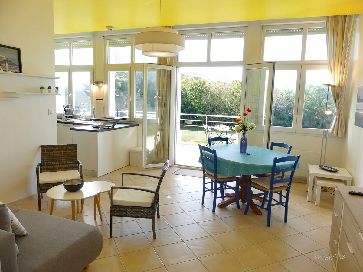 🌊 Duplex uitzicht op zee met tuin - Santec, Plage du Théven Schitterend duplex appartement op de 3e verdieping (geen lift) van een monumentaal condo doordrenkt van geschiedenis, met uitzicht op Plage du Théven in Santec. De flat biedt een panoramisch uitzicht op zee, directe privétoegang tot het strand via een beveiligde poort en een eigen tuin van 100 m² met een tafel met uitzicht op de oceaan.