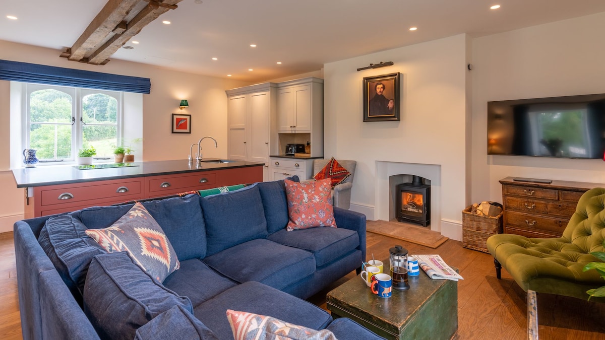 Zelfstandig luxe bijgebouw voor één of twee gasten. Een rustige en comfortabele ruimte om in te ontspannen. Afgewerkt naar een extreem hoge standaard, met hoge plafonds en eiken balken en palen. Volledig geïsoleerd met vloerverwarming, onder vlaggenstenen. De keuken is volledig uitgerust met een oven en kookplaat, magnetron, Airfryer, koelkast, vaatwasser, wasmachine. Gelegen op een prachtige, rustige locatie aan de grens tussen Engeland en Wales met een adembenemend uitzicht. De perfecte manier om het landelijke leven te ervaren.