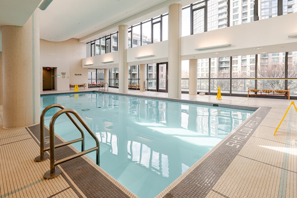Luxe, nieuw ingerichte woning weg van huis in het centrum van 300 Front Street met uitzicht op de CN Tower. 2 Slaapkamers 2 Badkamers, Comfortabel Kingsize bed TV en pak, Tweepersoonsbed TV met verduisteringsgordijnen Geniet in de fitnessruimte van het gebouw, de stoombad, het buitenzwembad met een 360 graden uitzicht op de stad, het bubbelbad en de barbecue. Op een steenworp afstand van CN Tower, Rogers Centre, Aquarium, Metro Convention Centre, op korte loopafstand van Scotiabank Arena, het meer, Bell Lightbox, Billy Bishop Airport, Union Station, Entertainment District en meer