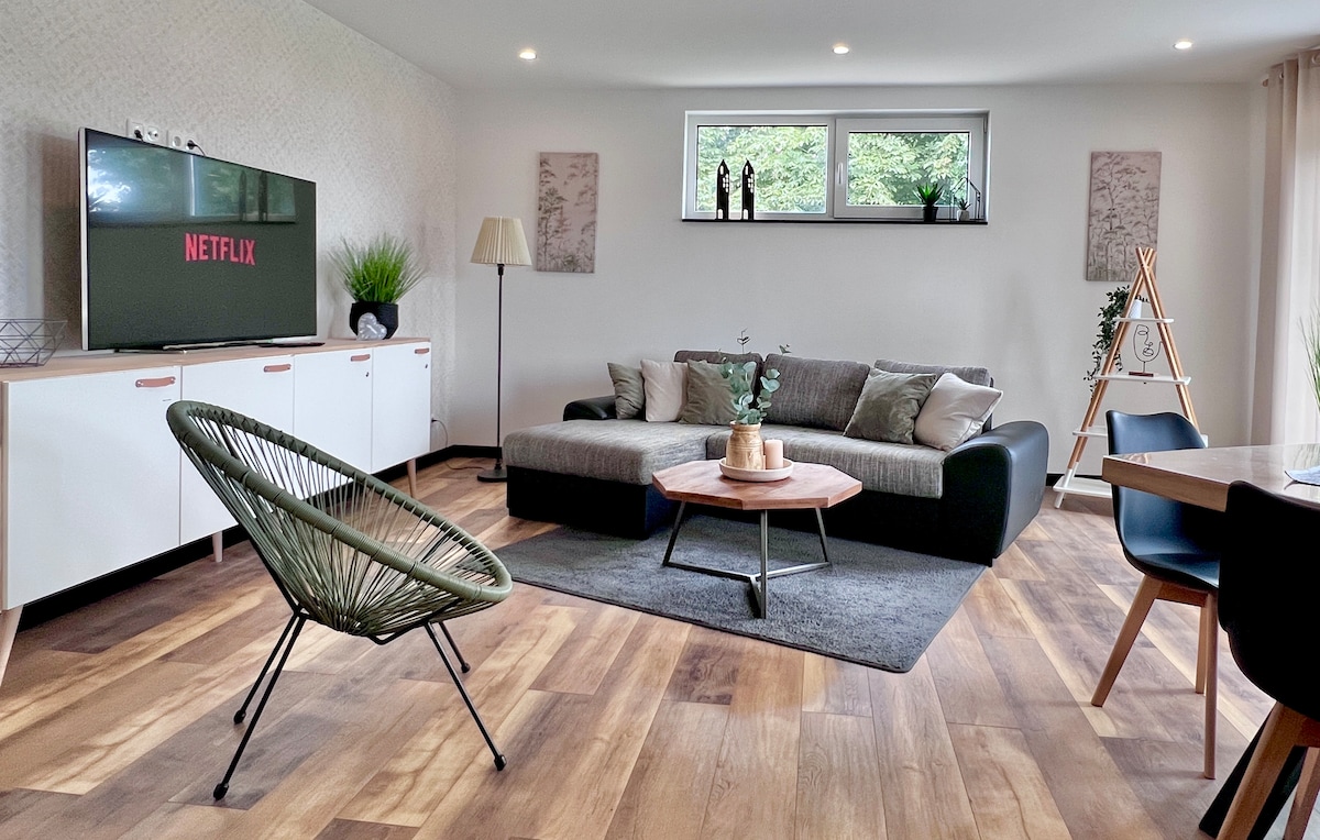 Voor de Landesgartenschau 2026 woon je bij ons op het platteland en op slechts 10 minuten afstand. Midden tussen beken, biotoop en weilanden met oude bomen, ligt een rustig gelegen en modern gerestaureerd molenlandgoed in de Bauhaus-stijl met nabijheid van de stad. De lichte woonkamer van 90 m ² grenst aan een groot dakterras, dat een prachtig uitzicht biedt en uitnodigt om te ontspannen. De historische molenkelders zijn omgebouwd tot een spa met sauna, whirlpool, ligstoelen en open haard