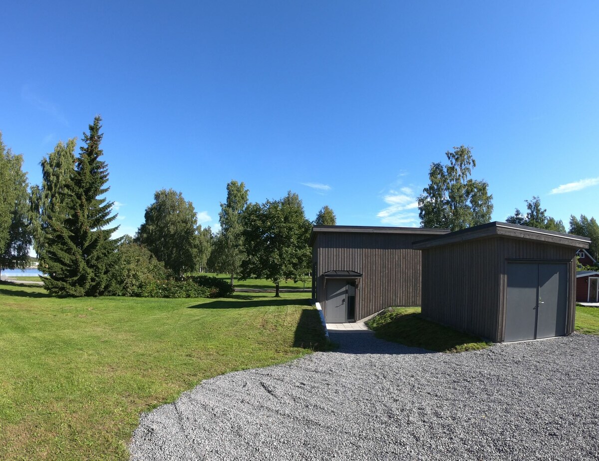 Veckorabatt och månadsrabatt erbjuds, efter överenskommelse. Luta dig tillbaka och koppla av i detta lugna, eleganta boende. Modern interiör, med kreativ design. Trivsel genom hållbarhet från en välisolerad byggnad med vattenburen golv-bergsvärme. Drick morgonkaffet med 100m till havsviken, jobba med snabbt Wi-Fi, motionera längs vattnet, utegymma eller sjunk ner i soffan för en stunds bokläsning, smart-Tv tittande. 2 byggnader: Hus och sidohus vent.& värmeväxlare med en extra enkelsäng
