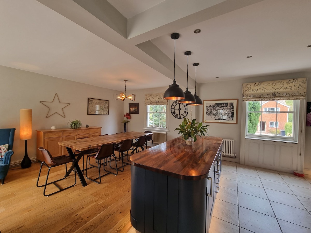 Het Koetshuis ligt op het terrein van het monumentale Erlands House, aan de rand van het mooie dorpje Crondall. Rustig met fantastisch uitzicht, wandelingen en pubs! 1 uur van Londen - ideaal voor gezinnen, vrienden of koppels. 2 slaapkamers met kingsize bed en eigen badkamer (1 bed kan worden opgesplitst in 2 eenpersoonsbedden), plus eenpersoonsbed op de overloop. Open keuken naar gewelfde receptie/eetkamer met vouwdeuren naar zonnig terras. 2 pubs, wijngaardcafé, dorpswinkel en M&S-eten allemaal binnen 1 mijl lopen op landelijke voetpaden.