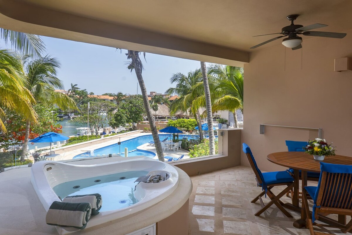 **Nieuwe data net geopend voor februari-maart 2026** Zeer gewild Chac Hal Al appartementencomplex ligt op de beste locatie in heel PA! Wij zijn gevestigd in een appartementencomplex aan de oceaan. Er zijn twee zwembaden en een privéstrand met palapa's, met uitzicht op de oceaan en de baai van Fatima. Ons appartement kijkt uit op de prachtige jachthaven en verzorgde tuinen. Korte wandeling naar restaurants en excursies. 2 verdiepingen penthouse appartement met 1 slaapkamer, 2 volledige badkamers, 2 ruime balkons, wifi, airconditioning, uitzicht op het water. Nieuwe aangepaste keuken.