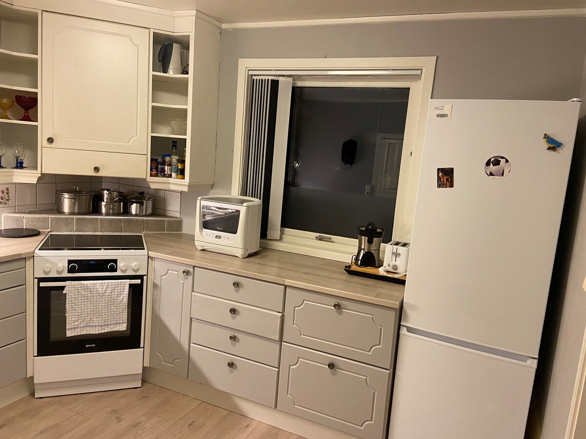 Ideaal voor 4 personen. Extra bed voor peuters. Mogelijkheid om op de bank of op extra matras te slapen. Op korte afstand tot de meeste dingen! 😊 200 m naar stadscentrum 🏙️ 500 meter naar Aspmyra Stadium ⚽ 1400 meter naar de luchthaven 🛫 1200 meter naar de veerhaven ⛴️ 850 m naar treinstation 🚂 Gelegen midden in het centrum van Bodø. Gratis parkeren op het terrein. Opladen van elektrische auto's ook mogelijk. Twee slaapkamers waar beide bedden van formaat 150x200 hebben. Buitenruimte, wifi, tv, wasmachine met droog en verder alles wat je nodig hebt.