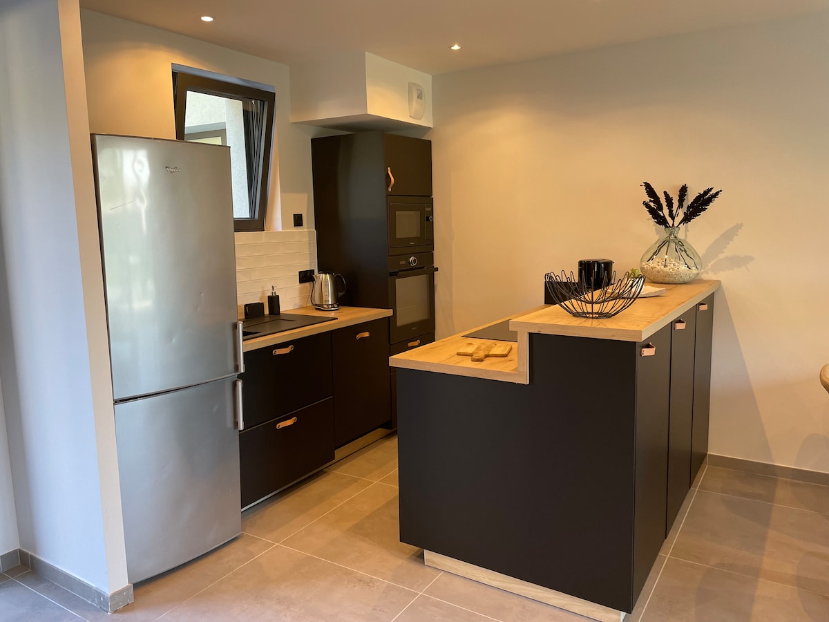 Dans un hameau, calme et ensoleillé à 5 mn du Lac, appart tout neuf de 55m2 et terrasse en RDC de notre villa Idéalement situé près des nombreuses activités sportives, parapentes, randonnées, plage, piste cyclable, Golfs - Grande pièce de vie, cuisine ouverte équipée ( four, micro ondes, lave-vaisselle, frigo /congélateur ) Salon/séjour avec canapé lit 160/200 -Chambre + dressing lit 160/200 -Salle de bain Douche à l’italienne -WC possibilité de louer 2 chambres salle de bain,WC,Terrasse