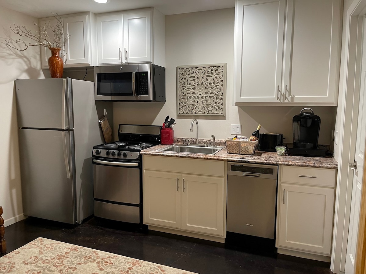 Dit is een perfecte accommodatie voor een overnachting of een korte reis. De reden hiervoor is dat er geen keuken is, alleen een kleine koelkast en magnetron. De bries tussen de gastensuite en het hoofdhuis wordt gedeeld met eigenaren, maar je hebt volledige privacy in de gastensuite die gescheiden is van het hoofdhuis. Onze supervriendelijke pups op het terrein begroeten graag iedereen! Geen schoonmaakkosten!