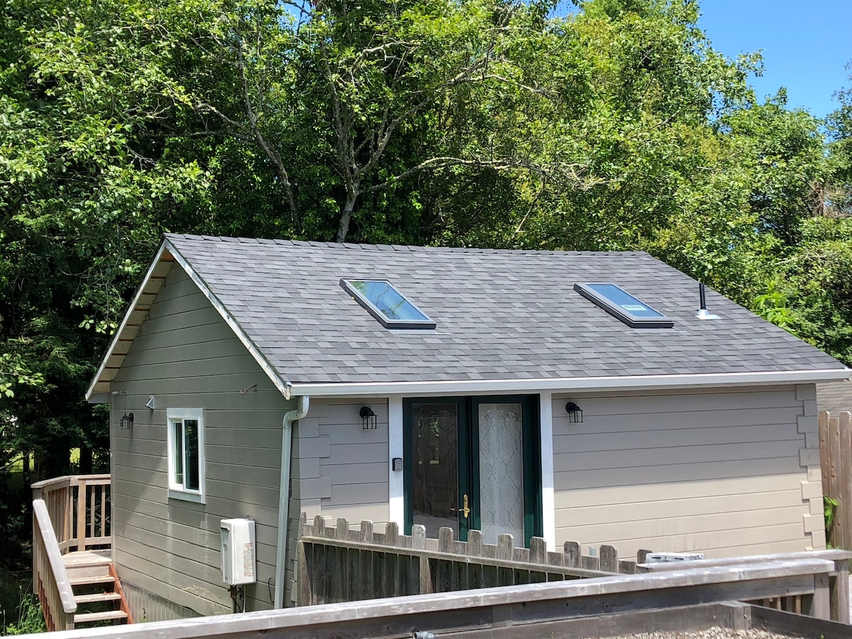 (Prijs is inclusief 10% bedbelasting en geen schoonmaakkosten!) Het tiny house 'barndominium' is een gezellige, gastvrije en unieke ruimte op een steenworp afstand van de restaurants, winkels, wandelpaden en live muziek van Ferndale. Onze locatie betekent dat je de auto kunt parkeren en naar alles kunt lopen wat Ferndale te bieden heeft. Geniet van onze rustige halve hectare aan de beek en het tuinatrium. Geweldige stop om de redwoods en wandelingen te verkennen. Strand, 5 mijl. Verhuurders publiceren een jaarlijkse Ferndale-gids. Zal een link sturen wanneer je boekt. Volg ons op de 'gram! @ferndaleairbnb.