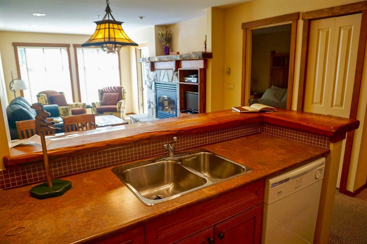 Deze rustige suite op de bovenste verdieping, omgeven door uitzicht op de bergen, beschikt over een gezellige woonkamer, open haard en slaapbank met multimediacentrum om je verblijf aangenaam te maken. De grote slaapkamer heeft een comfortabel kingsize bed. We hebben een volledig uitgeruste keuken en wasserette voor je eigen gemak. Geniet van toegang tot alle voorzieningen, waaronder een ondergrondse verwarmde parkeerplaats, een fitnessruimte, een zwembad, een bubbelbad en een stoombad. Slechts 5 minuten van de heuvel en een korte wandeling naar restaurants en bars.